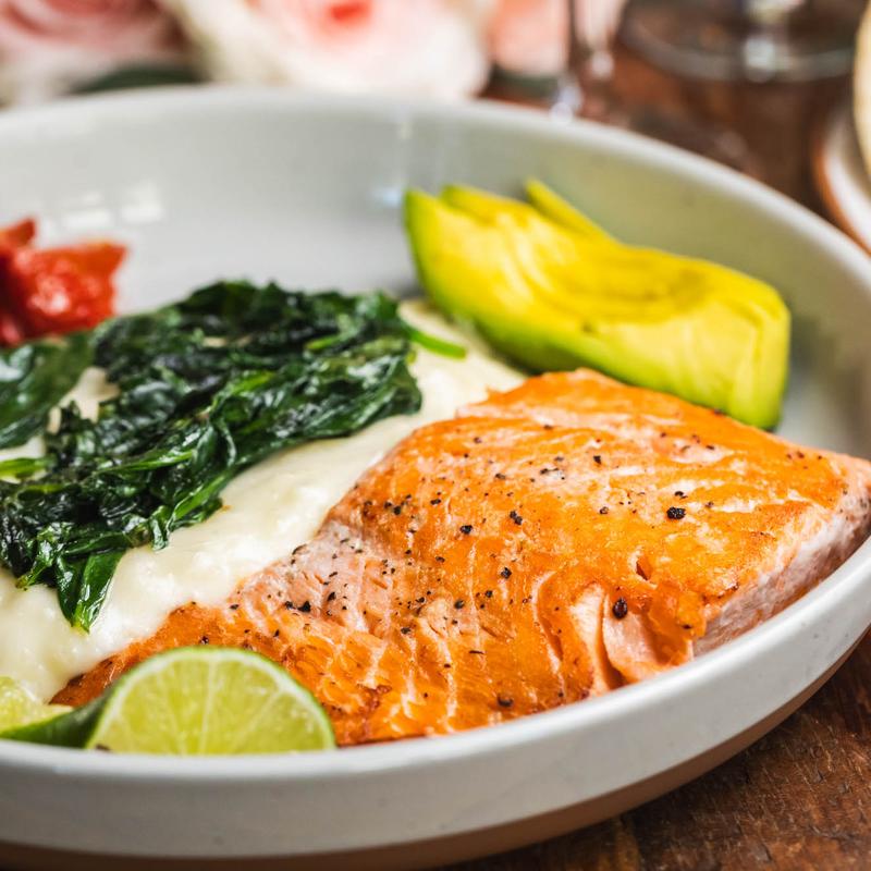 Ground salmon mixed with scallions, sesame seeds, soy sauce, and sriracha on brioche with mixed greens, garlic mayo, and onions (add tomato optional)